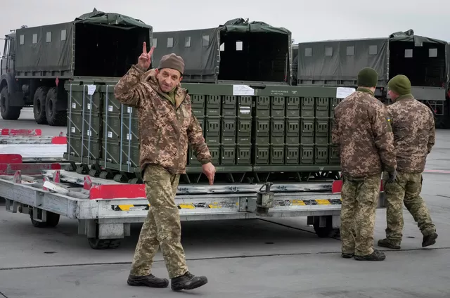 Một quân nhân Ukraine dỡ hàng viện trợ quân sự từ Hoa Kỳ tại sân bay Boryspil