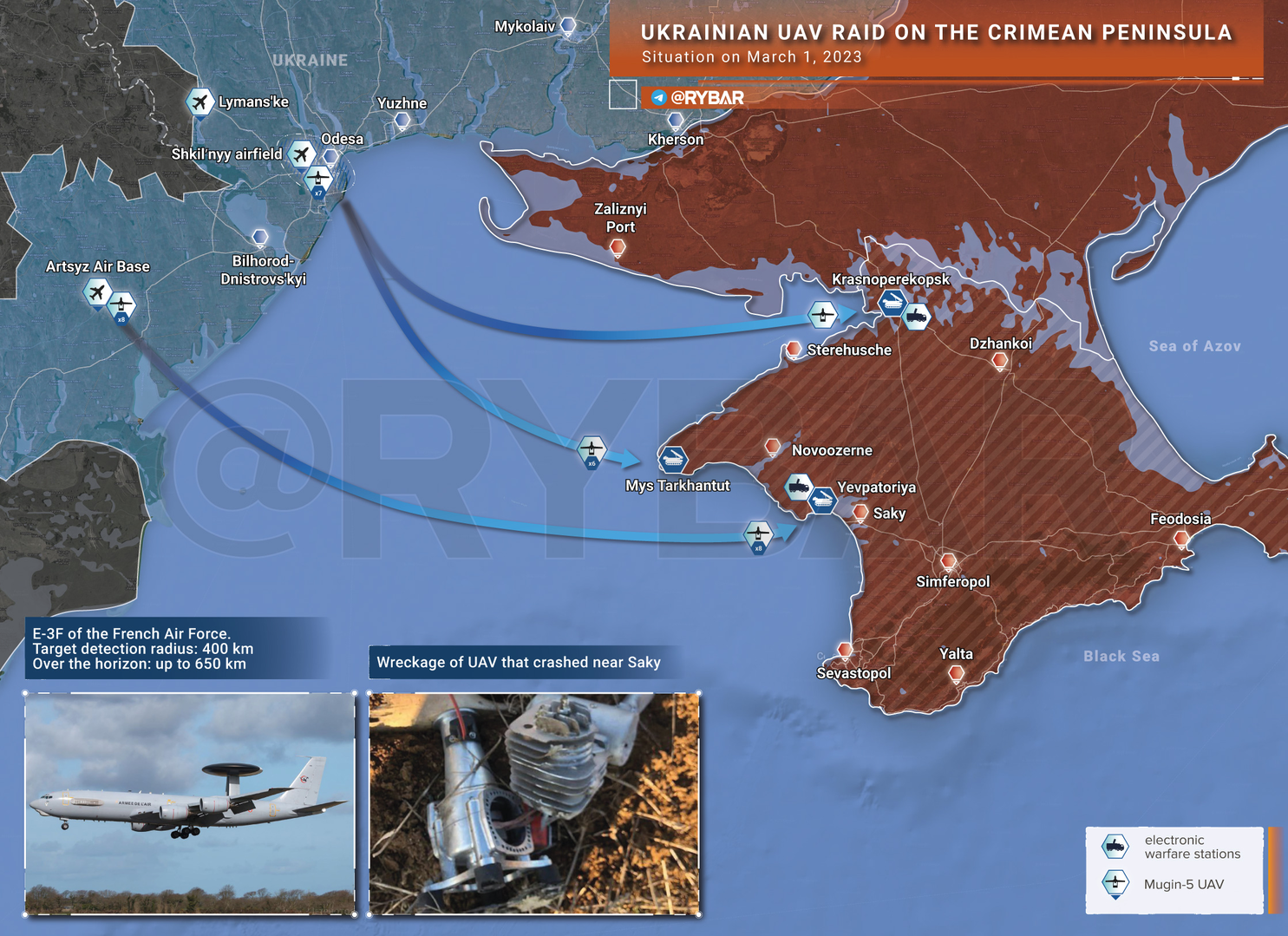 Ít nhất 15 UAV đã cất cánh từ sân bay Shkolny ở Odessa, cũng như Krasnoglinsky ở Artsyz ở phía nam khu vực. Trong số này, 6 chiếc bị bắn rơi gần làng Olenevka trên Mũi Tarkhankut, 8 chiếc được các đơn vị EW trồng gần Evpatoria và Saki, và một chiếc gần Krasnoperekopsk.