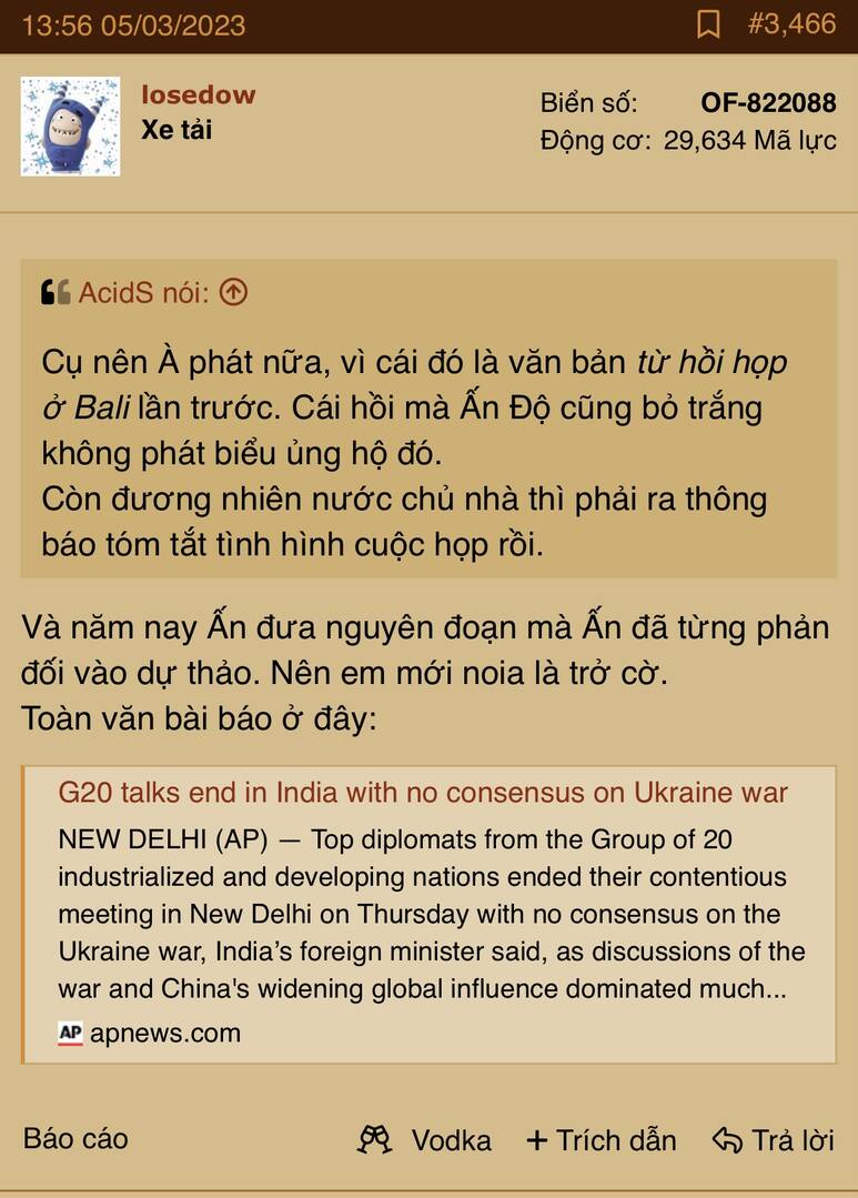 Cụ losedow có sang thớt bên này chơi không các cụ nhề, trước bên kia em thấy cụ ấy hay đăng bài về tình hình thế giới, nhưng sau vụ cụ ý khăng khăng là Tàu tẩn Đài thì Nhật đã can thiệp với nay đọc bài cụ ấy bảo khả năng Ấn trở cờ vì cái vụ ra thông báo G20 lên án Nga thì thấy thông tin cụ ấy toàn google với đọc wikipedia là chính chứ nhận định không được sâu sắc lắm.
