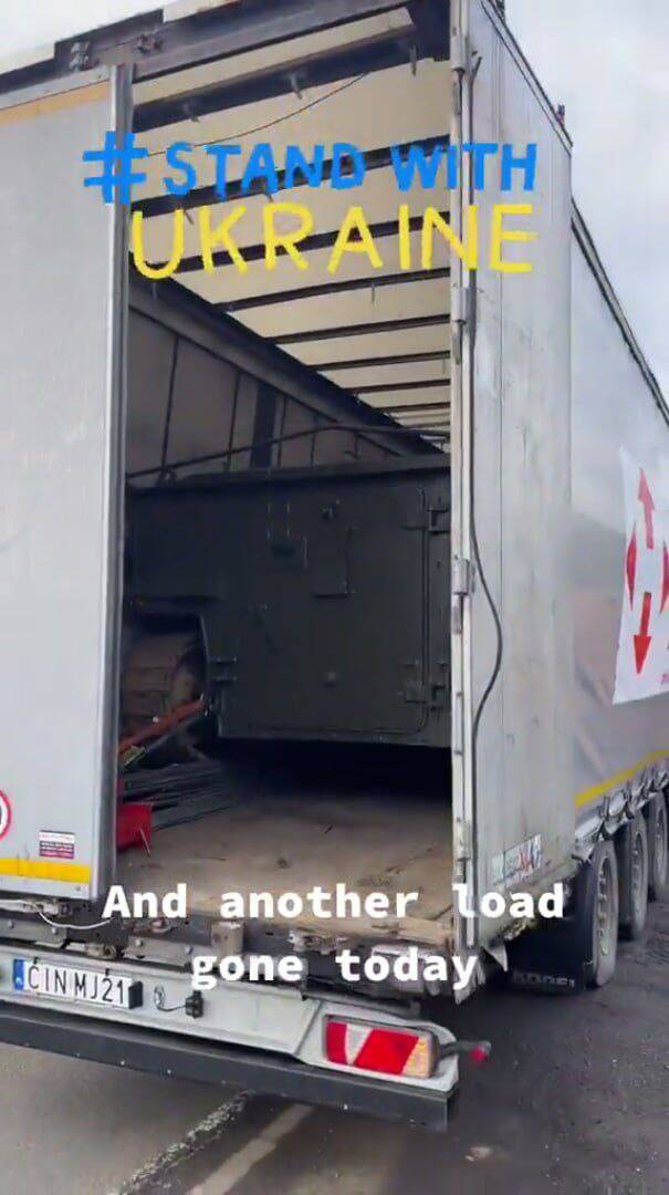 Các kênh truyền hình Ukraine đăng video vận chuyển thiết bị quân sự phương Tây bên trong xe tải của công ty chuyển phát nhanh và bưu chính Ukraine Nova Poshta; biểu tượng màu đỏ đặc trưng của tổ chức cụ thể này có thể nhìn thấy trên một trong các phương tiện.