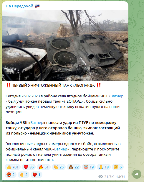 Hôm nay, ngày 26/02/2023, gần làng Yadnoye, các máy bay chiến đấu của Wagner PMC đã tiêu diệt chiếc xe tăng LEOPARD đầu tiên, các máy bay chiến đấu đã rất ngạc nhiên khi thấy các thiết bị của Đức được tung vào vị trí của chúng tôi.