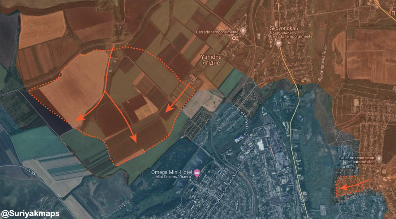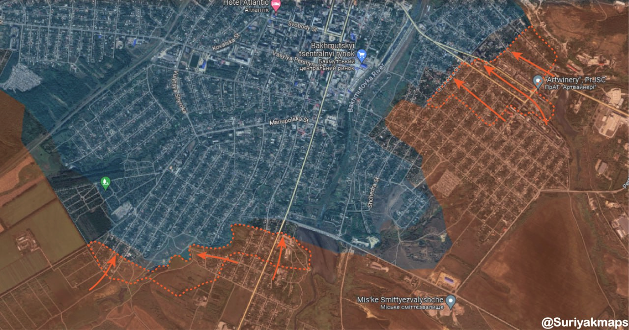 Tình hình phía đông và nam thành phố Bakhmut: Quân đội Nga đã giành được nhiều thắng lợi đáng kể ở quận Zabakhmutka và tiến về phía bắc vùng ngoại ô Opytne/Опитне, tiến đến đường Tsehlianyi. Hơn nữa, quân đội đã vào được các tòa nhà đầu tiên của quận Sobachivka.