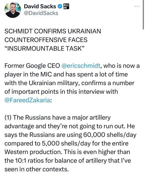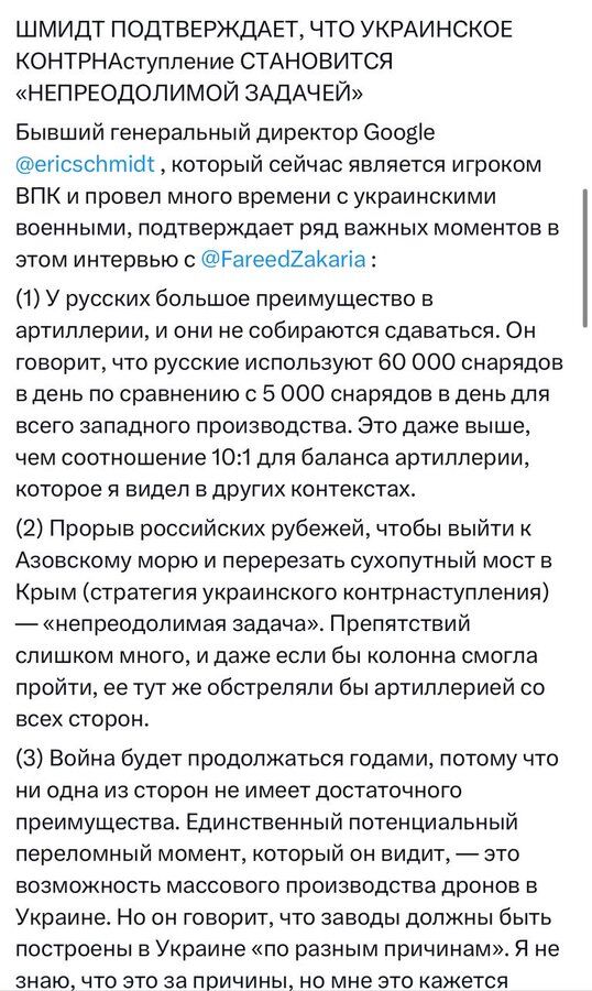 @SpriterTeam Cựu giám đốc điều hành Google, tỷ phú Eric Schmidt đã trả lời phỏng vấn, trong đó ông nói rằng nhiệm vụ phản công của Ukraine là "không thể vượt qua". Ngoài ra, Schmidt, giống như nhiều người khác, không hiểu tại sao, nếu các bên đi vào bế tắc, phương Tây không nói về hòa bình.