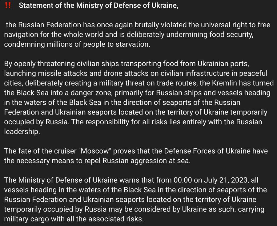 Bộ Quốc phòng Ukraine cho biết, tất cả các tàu đi đến các cảng của Nga ở Biển Đen, cũng như đến các cảng ở các vùng lãnh thổ mới của Liên bang Nga, sẽ được coi là chở hàng quân sự - "với tất cả các rủi ro liên quan".