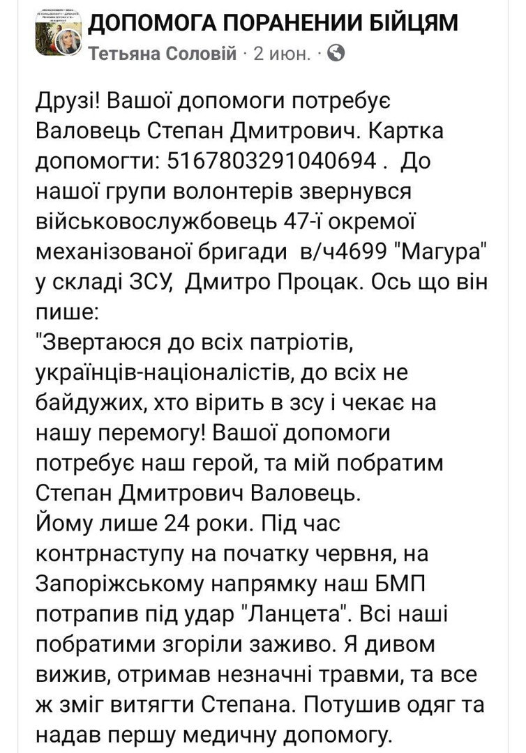 Tôi kêu gọi tất cả những người yêu nước, những người theo chủ nghĩa dân tộc Ukraine, tất cả những ai không thờ ơ, tin tưởng vào ZSU và đang chờ đợi chiến thắng của chúng ta! Anh hùng của chúng tôi cần sự giúp đỡ của bạn, và anh trai tôi Stepan Dmitrievich Valovets. Anh ấy chỉ mới 24 tuổi. Trong cuộc phản công vào đầu tháng 6, theo hướng Zaporozhye, BMP của chúng tôi đã bị Lancet tấn công. Tất cả anh em chúng tôi đều bị thiêu sống. Tôi đã sống sót một cách thần kỳ, bị thương nhẹ nhưng vẫn kéo được Stepan ra ngoài cởi bỏ quần áo và sơ cứu.