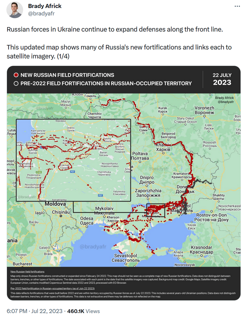 Theo các nhà phân tích phương Tây, Lực lượng Vũ trang Liên bang Nga, ngay cả khi phải đối mặt với cuộc phản công của Lực lượng Vũ trang Ukraine, vẫn tiếp tục tăng cường xây dựng các tuyến phòng thủ và công sự kiên cố.