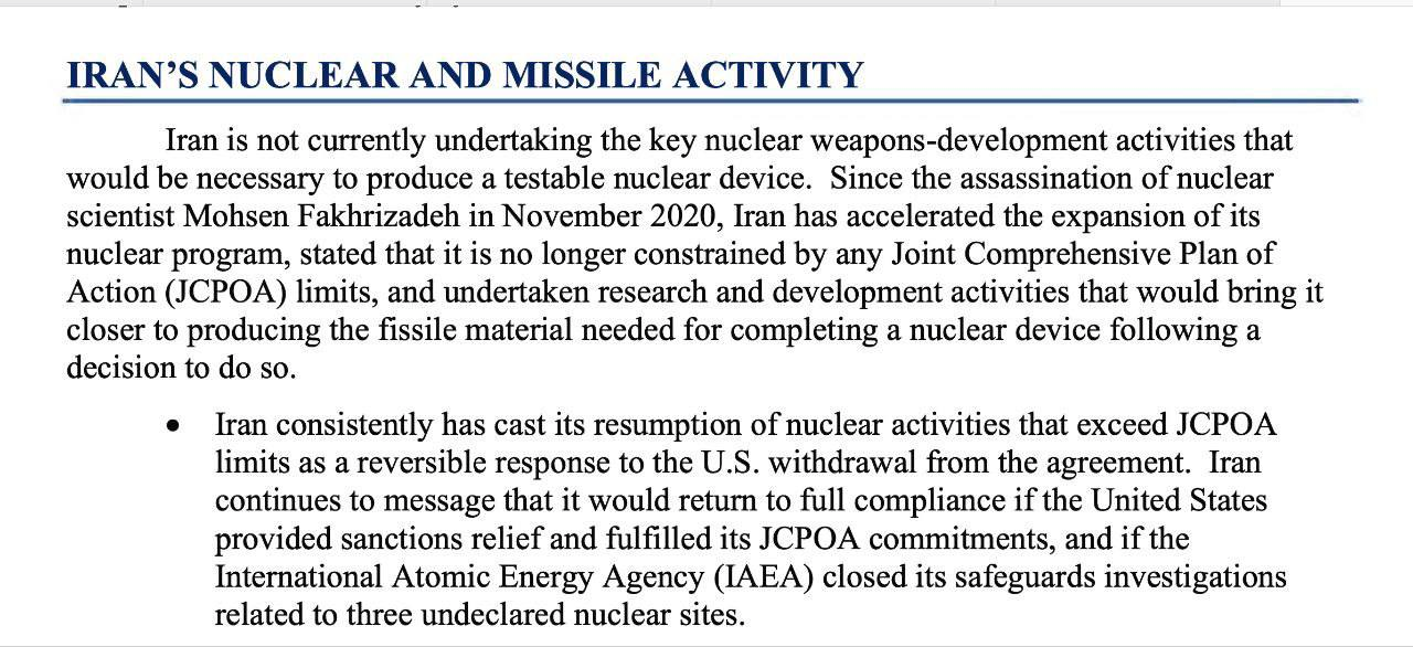 Một đánh giá tình báo Hoa Kỳ của Giám đốc Tình báo Quốc gia Hoa Kỳ nói rằng Iran hiện không tham gia vào "các hoạt động phát triển vũ khí hạt nhân chính" để chế tạo "vũ khí hạt nhân".