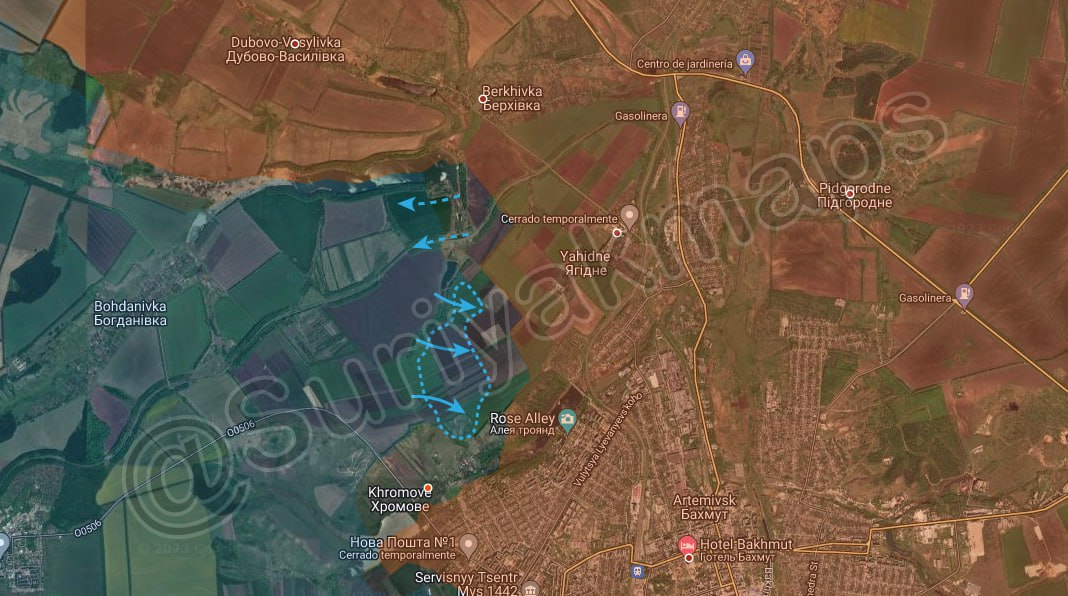 [ Photo ] Tình hình phía bắc Bakhmut: Quân đội Ukraine mở cuộc tấn công mới cách Berkhivka/Берхівка vài km về phía nam và chiếm lại một số ngọn đồi tiếp giáp với Khromove/Хромове và Yahidne/Ягідне. Mặt khác, các lực lượng Ukraine đã rút khỏi khu vực đập Berkhivka do hoạt động pháo kích dữ dội của Nga.
