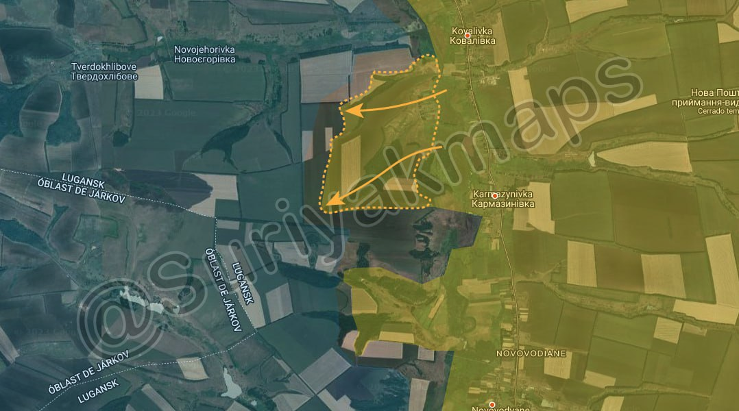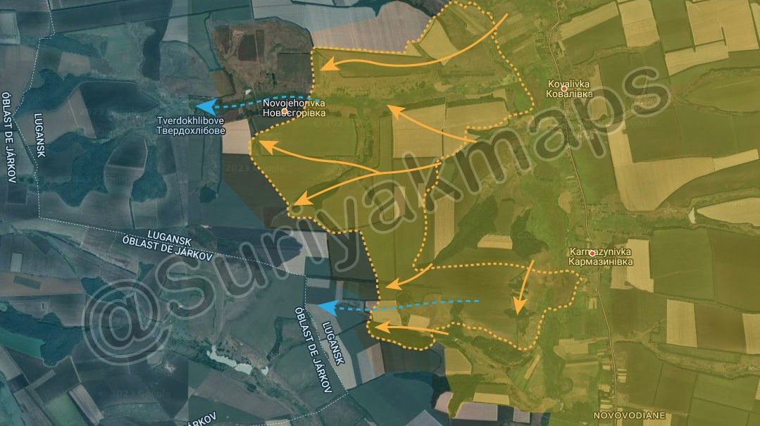 [ Photo ] Tình hình tại mặt trận Luhansk: Quân đội Nga đã đạt được những bước tiến đáng kể trong vài giờ qua khi giành quyền kiểm soát những ngọn đồi nhìn ra Novojehorivka/Новоєгорівка bao gồm cả một phần của chính ngôi làng. Như đã nói trước đây, còn quá sớm để nói rằng đây là sự khởi đầu của một cuộc tấn công lớn của Nga. Tuy nhiên, các lực lượng Nga đang tận dụng thời điểm này với bước đột phá mới này và việc sử dụng nhiều pháo binh (so với phía Ukraine ở trục này) bằng cách giành quyền kiểm soát càng nhiều lãnh thổ càng cao càng tốt nhằm tạo ra một đầu cầu vững chắc cho một cuộc tấn công trong tương lai nhằm đến sông Oskil và tiến vào lại những khu vực đã mất vào năm 2022.