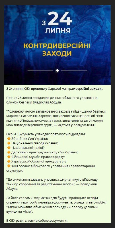 ✖️ Những người đăng ký của chúng tôi báo cáo rằng từ ngày 24 tháng 7, SBU, với sự tham gia của các sĩ quan cảnh sát, công tố viên, nhân viên thực thi pháp luật và các cơ quan thực thi pháp luật khác, có kế hoạch tiến hành các cuộc đột kích vào thường dân để tìm kiếm các nhóm lật đổ thân Nga .