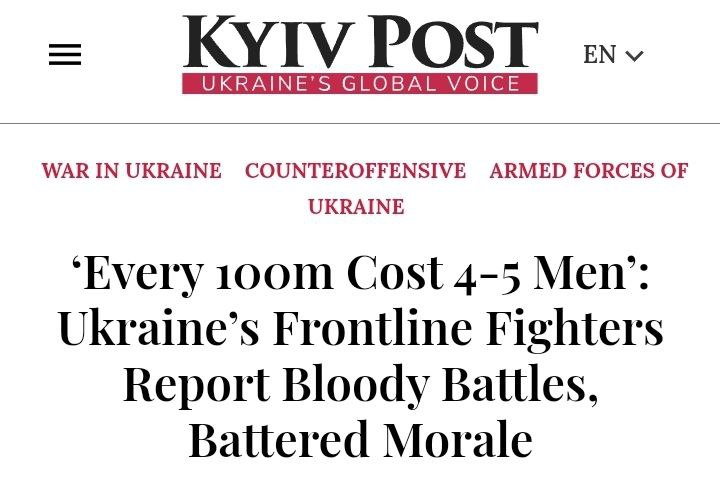 Lực lượng Vũ trang Ukraine nơi tuyến đầu trong những trận chiến đẫm máu và tinh thần sa sút - Kiev PostNhững người Ukraine ở tiền tuyến đang bày tỏ sự đau khổ về tinh thần xuống thấp do tổn thất đáng kể, nguồn cung cấp không đủ và không có tiến triển rõ rệt trong cuộc tấn công.Những người ở tiền tuyến sợ bị giết ngay cả trước khi thực hiện bất kỳ bước đột phá nào trên mặt trận.Những người đóng quân ở tiền tuyến chia sẻ cách các đơn vị của họ chiếm được các công sự của Nga chỉ để rồi lại đánh mất chúng vì Lực lượng vũ trang Ukraine đã được huấn luyện để chiếm các vị trí phòng thủ chứ không phải giữ chúng.Chiếm cứ điểm của Nga đồng nghĩa với việc trở thành mục tiêu không thể tránh khỏi.Các đơn vị tiền tuyến của Lực lượng vũ trang Ukraine chịu thương vong, cả thiệt mạng và bị thương, không chỉ do bãi mìn mà còn do bẫy mìn, xe tăng bắn từ các vị trí xa, pháo dẫn đường bằng máy bay không người lái, bom dẫn đường và không dẫn đường.