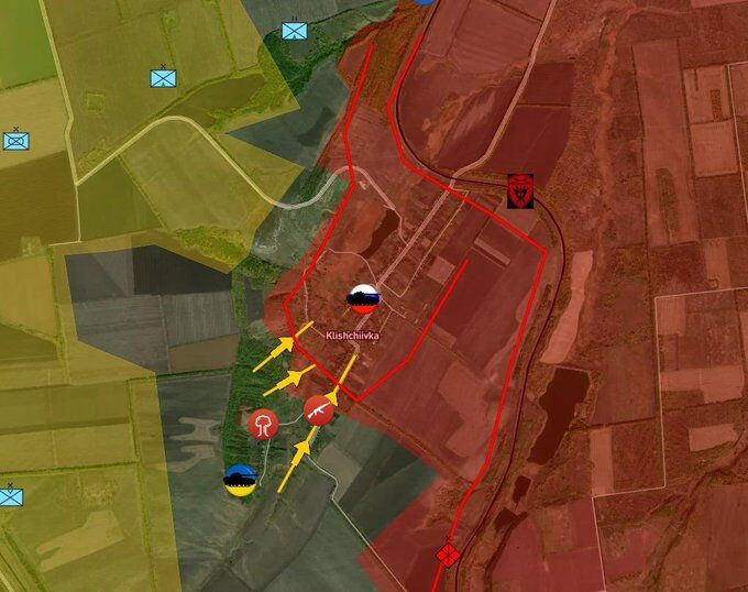 Trong trường hợp Nga rút lui khỏi Kleshcheevka, tiền tuyến sẽ đi ở vị trí thứ hai (đường màu đỏ dài hơn). Lực lượng vũ trang Nga đã rút khỏi những ngọn đồi, vì vậy theo logic quân sự, họ nên lùi về đường màu đỏ thứ hai. Việc bị mất Kleshcheevka sẽ không thực sự đe dọa Bahmut như vẫn được hiểu vì Lực lượng vũ trang Nga sẽ lùi về vị trí mới tại các tuyến đường sắt và gần sông. Thực tế là cuộc tấn công của Ukraine ở đây bắt đầu vào tháng 5 và chỉ đến tháng 7 họ mới có được những thành quả đầu tiên là rất quan trọng.
