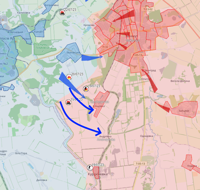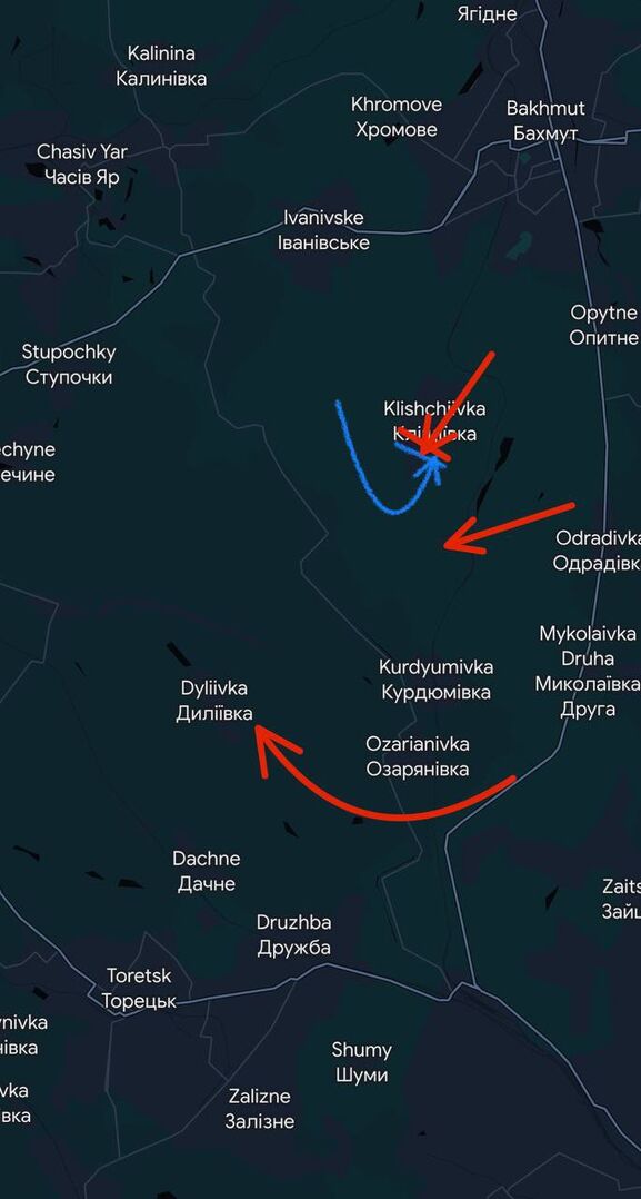 2) Lực lượng Nga phản công gần Andreyevka, phía nam Kleshcheyevka, chiếm lại các vị trí gần khu định cư đã mất trước đó. Ngôi làng vẫn nằm trong vùng xám.