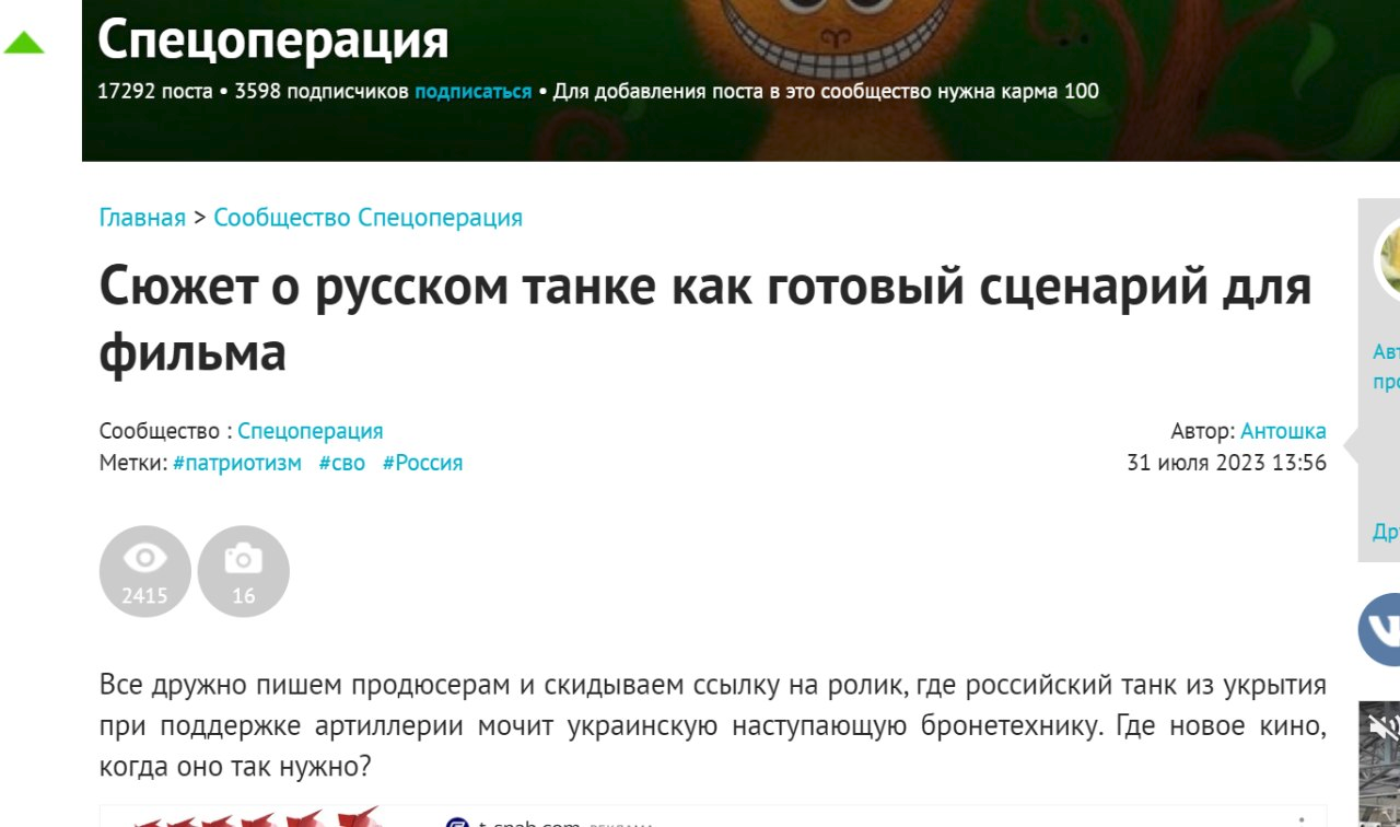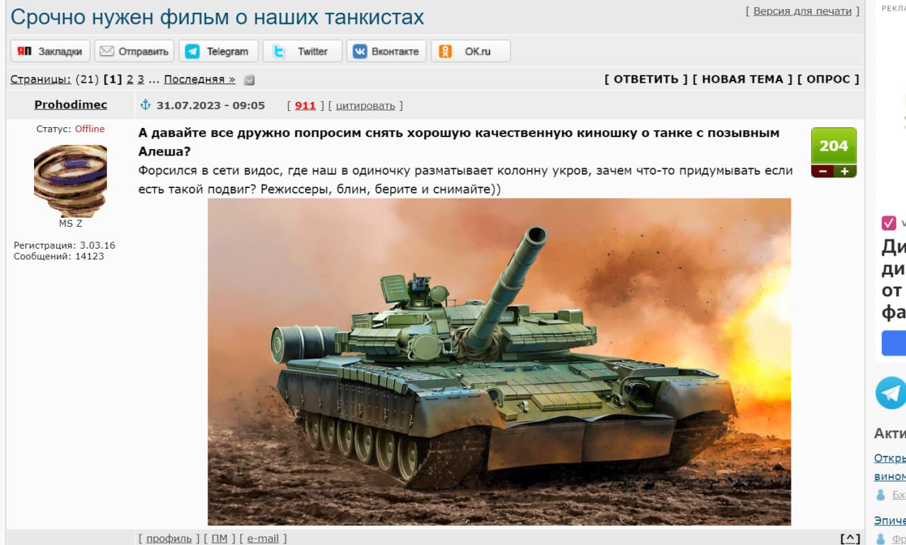 🇷🇺 Khán giả Nga đang yêu cầu làm một bộ phim dài tập hoặc phim tài liệu chất lượng cao về lối thoát chiến đấu của ba lính tăng đã chặn đứng bước đột phá của tám xe bọc thép Ukraine.