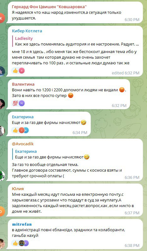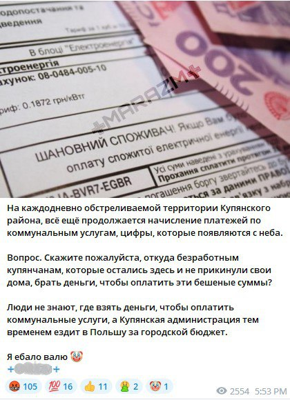 Những người đăng ký các kênh địa phương chia sẻ rằng họ phải trả 10.000 hryvnia (24.900 rúp) tiền xăng, và tổng hóa đơn cho các dịch vụ nhà ở và xã lên tới 28.000 hryvnia. (69.000 rúp).