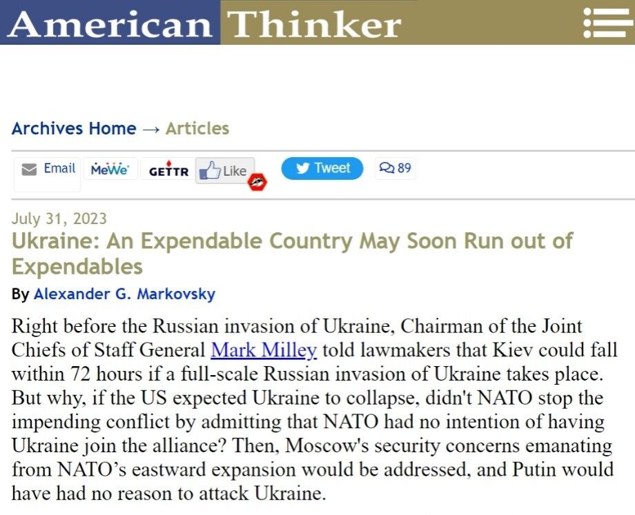 Các nhà lãnh đạo NATO hoàn toàn hài lòng rằng người Ukraine đang chiến đấu và bản thân họ không tham gia vào cuộc đối đầu với một cường quốc hạt nhân, vì vậy họ đã không để Zelensky thất vọng về những trò hề của mình. Một số thậm chí còn tức giận vì Ukraine đã đứng vững trước cuộc tấn công đầu tiên của Nga. Theo tướng Mark Milley, về nguyên tắc, NATO không kỳ vọng Ukraine sẽ giữ được độc lập.