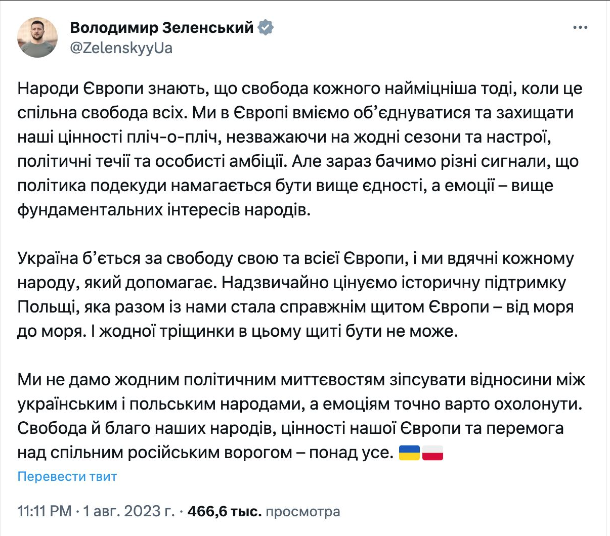 Bộ Ngoại giao Ba Lan cho rằng quan hệ của nước này với Ukraine gần đây không được tốt nhất có thể. Theo Thứ trưởng Ngoại giao Ba Lan Yablonsky, đó là do một số cảm xúc thiếu kiềm chế từ phía chính quyền Ukraine. Ông nói thêm rằng Ba Lan có thể hiểu phản ứng như vậy là do U bị tấn công, nhưng cũng cần biết rằng nước này không nên tấn công các đồng minh của mình. Trước đó, xung khắc đã nảy sinh do những tuyên bố của một nhân viên trong chính quyền tổng thống Ba Lan, cho rằng U không đánh giá cao sự giúp đỡ. Cũng giống như khi bị Anh chửi là vô ơn, Zelensky lại lẻo mép: rằng U biết ơn mọi quốc gia đã hỗ trợ, rẳng U đang chiến đấu vì tự do cho cả châu Âu???