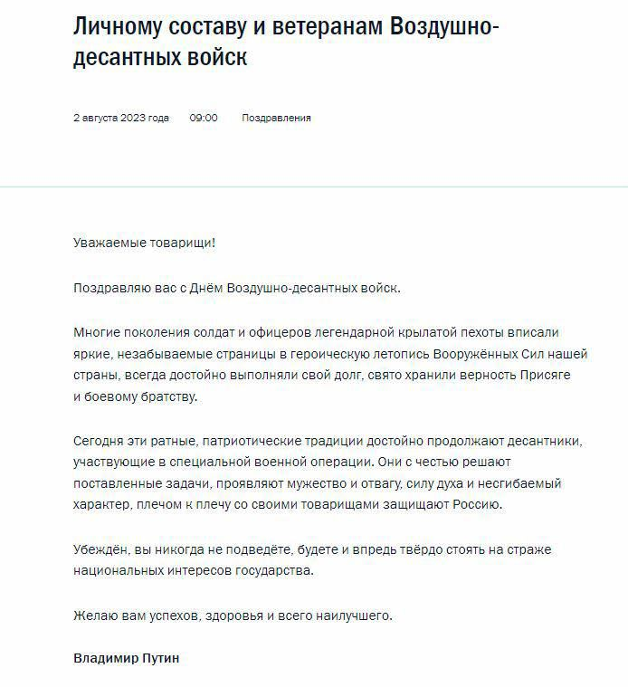 Ngày nay, những truyền thống quân sự, yêu nước này được tiếp tục một cách xứng đáng bởi những người lính nhảy dù tham gia vào một chiến dịch quân sự đặc biệt. Họ giải quyết các nhiệm vụ được giao một cách vinh dự, thể hiện lòng can đảm và dũng cảm, tính cách kiên cường và không khuất phục, kề vai sát cánh bảo vệ nước Nga với các đồng chí của họ”, bức điện chúc mừng viết.
