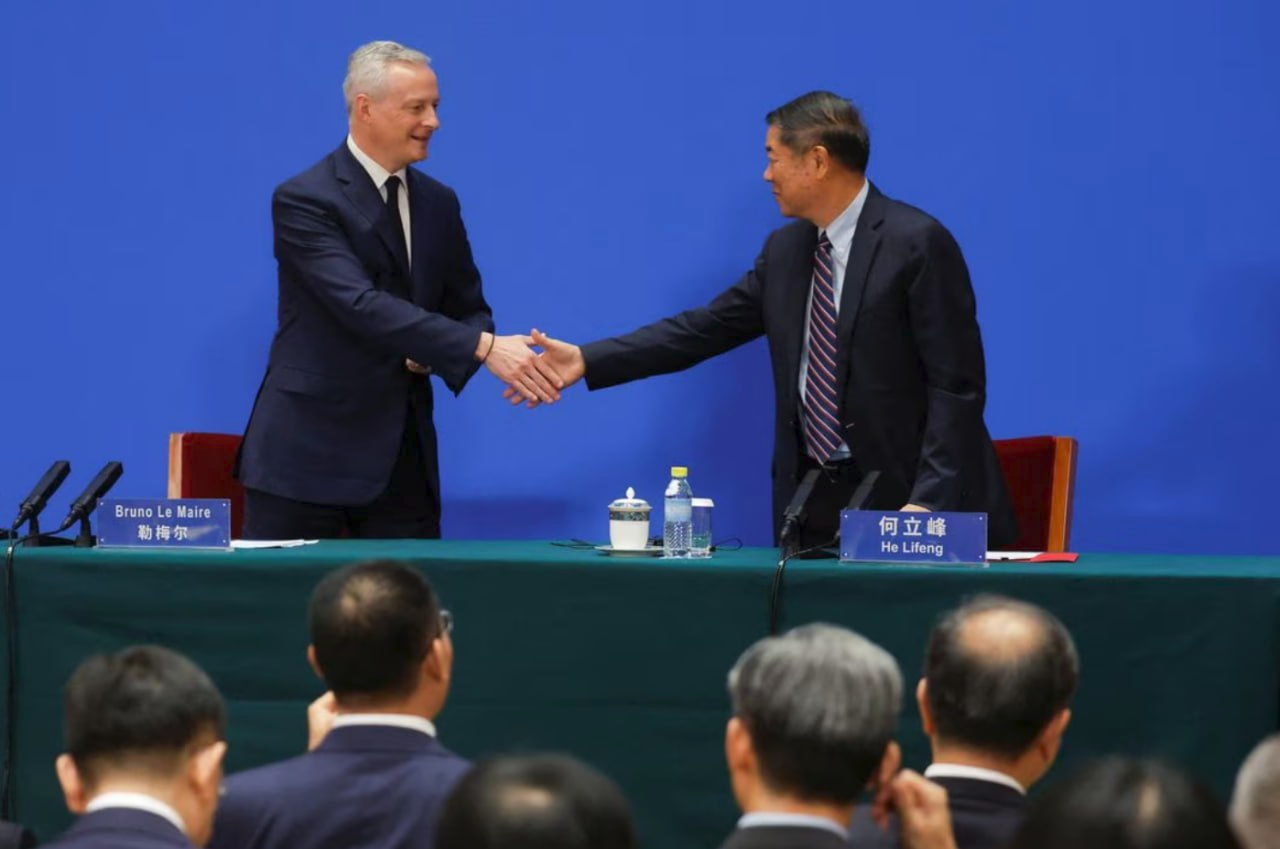 Bộ trưởng Tài chính Pháp Bruno Le Maire hôm Chủ nhật thừa nhận Pháp cảnh giác đối mặt với "một số rào cản pháp lý hoặc một số rào cản khác để tiếp cận thị trường Trung Quốc" sau khi hội đàm với Phó Thủ tướng Trung Quốc He Lifeng, tuyên bố rằng Paris quan tâm đến nhiều hơn " quan hệ thương mại cân bằng".