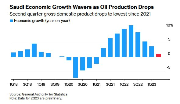 Bloomberg viết: Tăng trưởng kinh tế của Ả-rập Xê-út chậm lại trong quý 2 do cắt giảm sản lượng dầu và giá giảm đã biến nước này từ một trong những nước tăng trưởng nhanh nhất trong G20 thành một trong những nước chậm nhất.