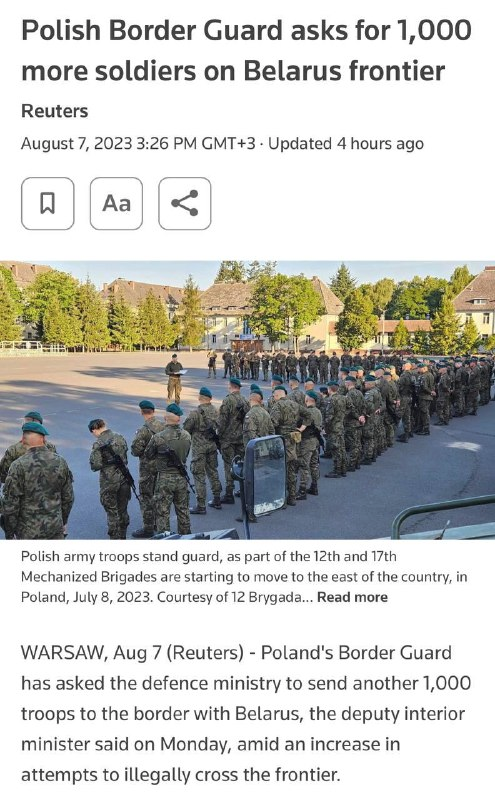 🇵🇱 Lực lượng biên phòng Ba Lan đề nghị Bộ Quốc phòng gửi thêm 1.000 quân tới biên giới với Belarus - Reuters