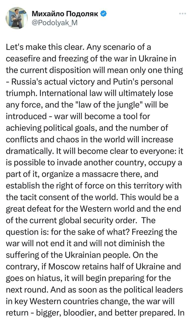 “Bất kỳ kịch bản nào về ngừng bắn và đóng băng chiến tranh ở Ukraine theo cách sắp xếp hiện tại sẽ chỉ có một ý nghĩa duy nhất - chiến thắng thực sự của Nga ... Đây sẽ là một thất bại lớn đối với thế giới phương Tây và là dấu chấm hết cho trật tự an ninh toàn cầu hiện có ," anh đã viết.