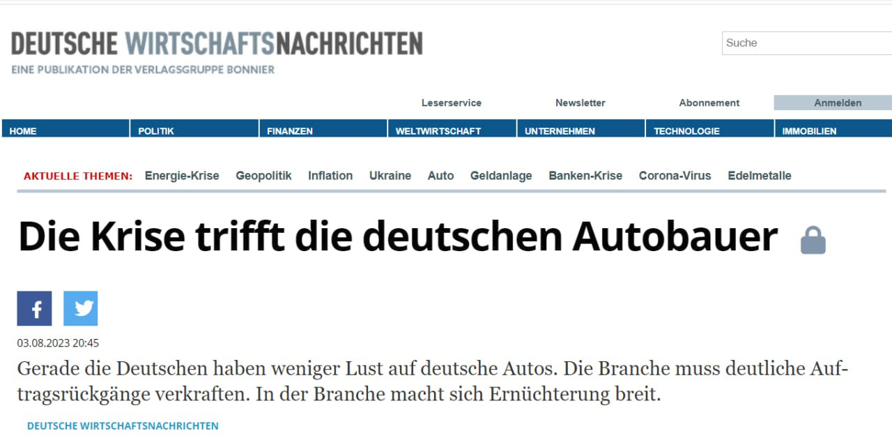 Theo Deutsche Wirtschafts Nachrichten, ngành công nghiệp ô tô Đức đang gặp khủng hoảng. Lượng đơn đặt hàng giảm xuống mức thấp kỷ lục trong 2,5 năm qua.