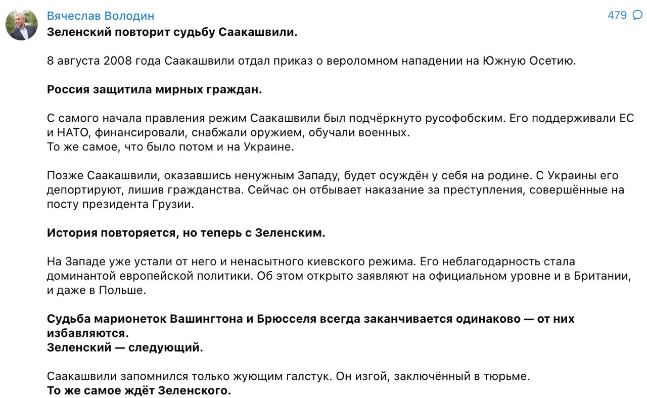 📝 “Saakashvili chỉ được nhớ đến khi nhai cà vạt. Anh ta là một kẻ bị ruồng bỏ trong tù. Zelensky là người tiếp theo,” chủ tịch của Duma viết trên kênh TG.