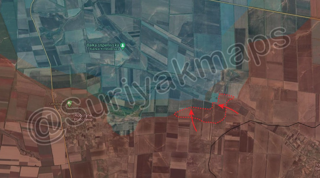 Đoạn video của RIA Novosti cho thấy thị trấn Robotyne/Роботине nằm dưới sự kiểm soát của Nga. Bất chấp những trận chiến khốc liệt trong hai tháng qua ở phía bắc của nó, Quân đội Ukraine đã không thể tiếp cận ngay cả những tòa nhà đầu tiên của thị trấn. Mặt khác, Quân đội Nga đã cố gắng chiếm lại các vị trí mới ở phía đông bắc của nó.