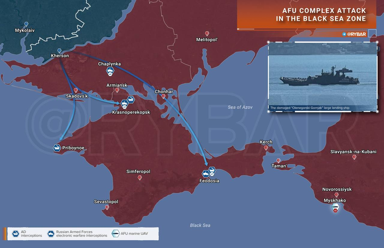 🔻Chi tiết về cuộc tấn công vào Novorossiysk cũng đã xuất hiện. Một chiếc thuyền không người lái (USV) của Ukraine đã đâm vào mạn trái của tàu đổ bộ cỡ lớn Olenegorsky. Kết quả là một trong các khoang bị ngập nhưng con tàu vẫn nổi và sẽ được sửa chữa.