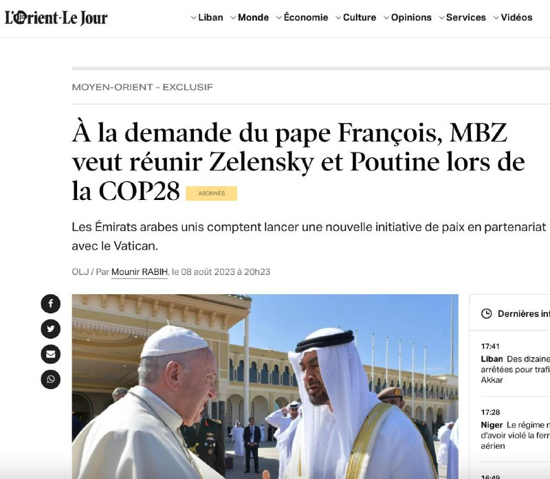 🇦🇪 Cuộc gặp giữa Putin và Zelensky sẽ được tổ chức bởi Tổng thống Các Tiểu vương quốc Ả Rập Thống nhất trong khuôn khổ hội nghị về biến đổi khí hậu của Liên hợp quốc sắp tới COP28 - Báo L'Orient-Le Jour