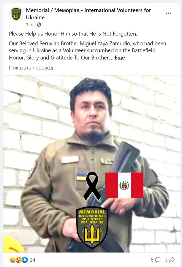 Trên các mạng xã hội, họ đưa tin về người lính đánh thuê đầu tiên được xác nhận chầu trời, đến từ Peru.