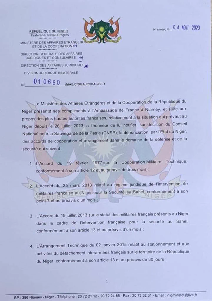 Hợp đồng đầu tiên được ký kết vào tháng 2 năm 1977. Ngoài ra, Niger đã thông báo cho Pháp về việc chấm dứt Thỏa thuận ngày 25 tháng 3 năm 2013 về chế độ pháp lý cho sự hiện diện của quân đội Pháp tại Niger để đảm bảo an ninh ở Sahel.
