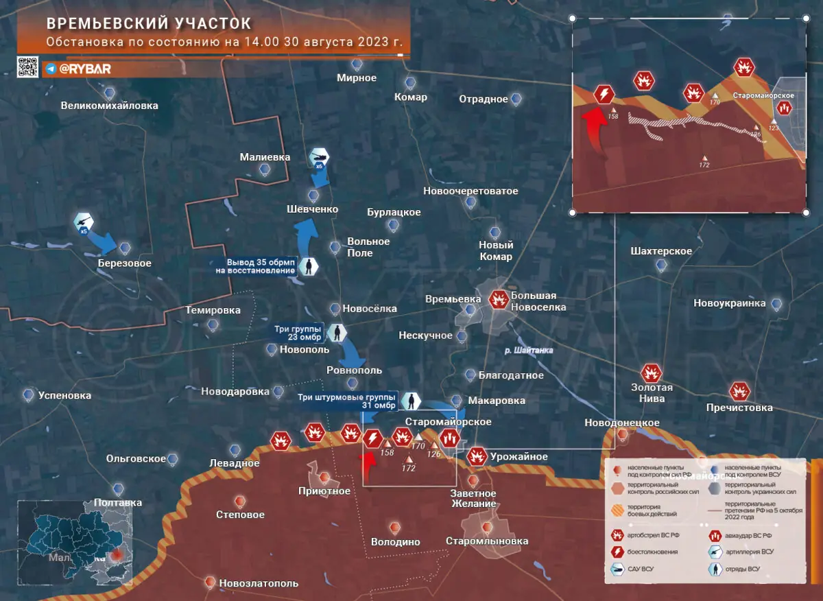 Tại khu vực Vremievsk, các đội hình của Ukraine đang tập hợp lại do bị tổn thất nặng nề trong nỗ lực chiếm phòng tuyến Staromayorskoe-Urozhaynoe. Thủy quân lục chiến thuộc Quân đoàn thủy quân lục chiến số 35 của Hải quân Ukraine đã được rút về Shevchenko để phục hồi.