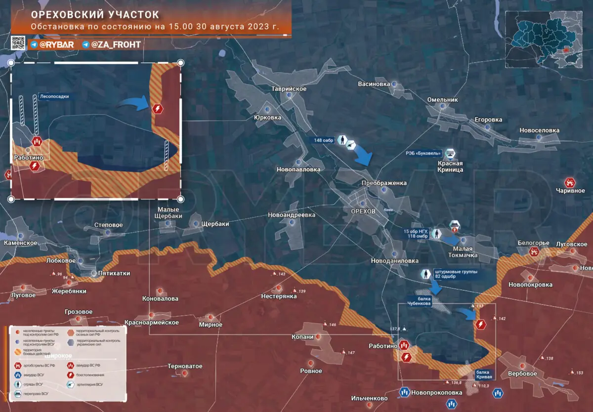 Tại khu vực Orekhov, các cuộc đụng độ ác liệt tiếp tục diễn ra ở khu vực Rabotino và Verbovoe, nơi kẻ thù tiến về phía tuyến phòng thủ của Lực lượng Vũ trang Nga. Theo hướng Kherson, các nhóm biệt kích của địch đổ bộ vào tả ngạn sông Dnieper gần Podstepnoe: một trận chiến đang diễn ra.