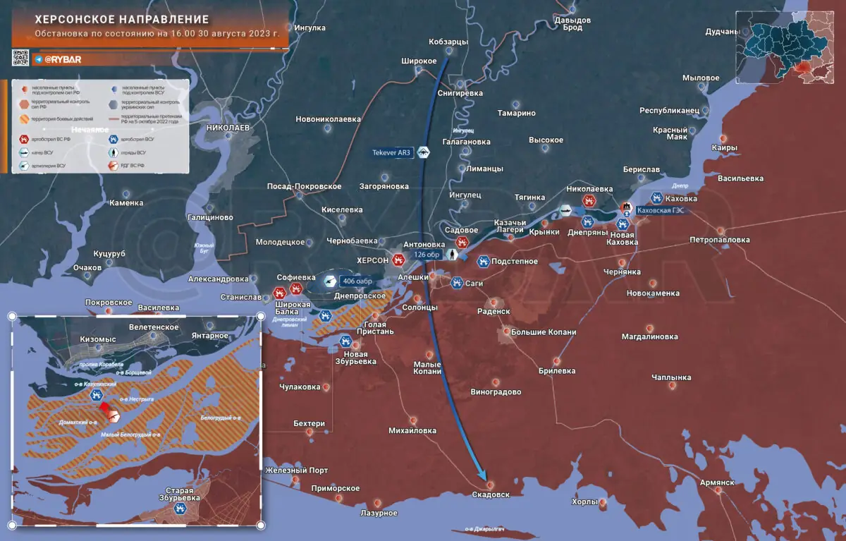 Theo hướng Kherson, các phân đội thuộc lữ đoàn phòng thủ lãnh thổ số 126 lại đổ bộ vào vùng xám ở tả ngạn sông Dnieper, cách Podstepnoe 4 km về phía tây bắc gần trang trại sinh thái. Một chiếc thuyền chở nhu yếu phẩm và thực phẩm đã được gửi đến đó vào ban đêm. Có lẽ, trong tương lai gần, từ đó sẽ lại có những nỗ lực tấn công vào các vị trí của quân đội Nga gần Trại Cossack, như chúng tôi đã nói vài ngày trước. Cùng lúc đó, ở bờ đối diện, các phân đội thuộc lữ đoàn phòng thủ lãnh thổ thứ 121 của Lực lượng Vũ trang Ukraine đang chờ sẵn. Một nhóm biệt kích khác của kẻ thù, dưới sự yểm trợ của súng cối và máy bay trực thăng với hệ thống thả lựu đạn, lại đổ bộ lên đảo Pereyaslavsky. Pháo binh của Lực lượng Vũ trang Liên bang Nga đang bắn vào chúng.