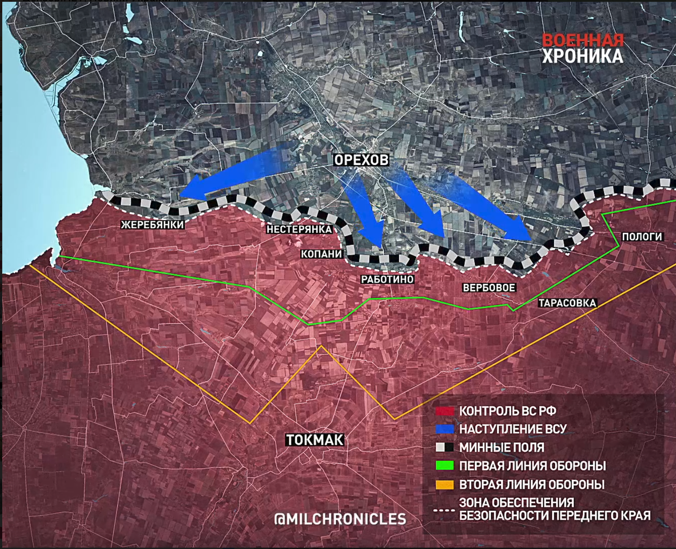 Lực lượng vũ trang Ukraine vẫn đang tiến theo ba hướng chính: Pyatikhatki - Zherebyanki, Rabotino - Verbovoye, Tarasovka và Pologi. Cuộc giao tranh ác liệt nhất diễn ra ở khu vực Pyatikhatok và Rabotin. Ở đó, Lực lượng vũ trang Ukraine đang cố gắng tiến lên nhưng bị mất trang bị hạng nặng. Nguồn của Biên niên sử quân sự ở những khu vực này lưu ý rằng Pyatikhatki, Zherebyanki và Rabotino là một phần của cái gọi là khu vực an ninh tiền tuyến. Trên thực tế, đây là những khu vực kiên cố tiên tiến, phía trước là các bãi mìn và cái gọi là khu vực phá hủy thiết bị của Ukraine. Khu vực kiên cố tiền tuyến không phải là một phần của tuyến phòng thủ đầu tiên và đóng vai trò như một hàng rào bảo vệ.