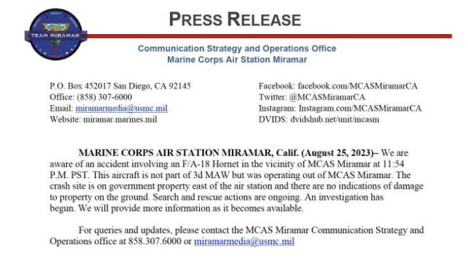 Vụ việc liên quan đến một chiếc F/A-18 "Hornet" đóng tại căn cứ Không quân Thủy quân lục chiến Miramar, xảy ra lúc 11:54 PST, như đã nêu trong một thông cáo của căn cứ.