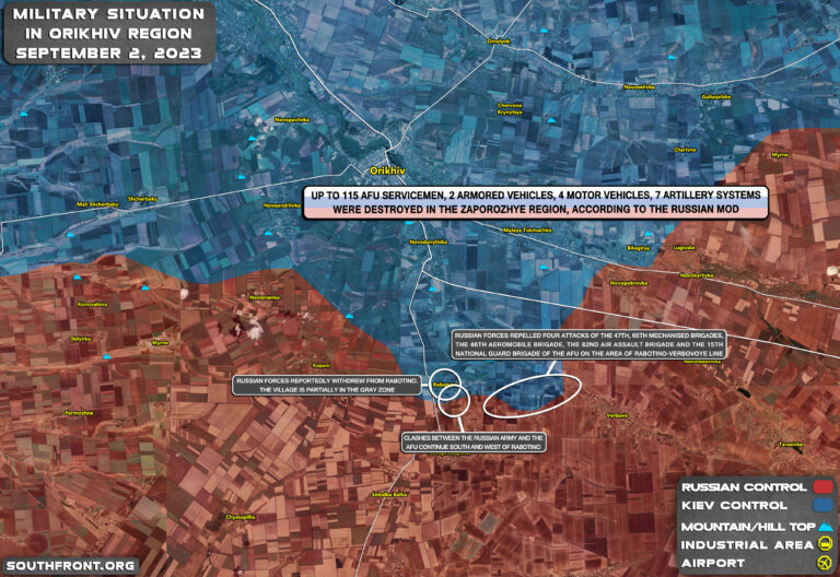 Lực lượng Nga đã đẩy lùi bốn cuộc tấn công của Lữ đoàn cơ giới số 47, 65, Lữ đoàn cơ động máy bay số 46, Lữ đoàn tấn công đường không số 82 và Lữ đoàn vệ binh quốc gia số 15 của AFU trên khu vực tuyến Rabotino-Verbovoye;