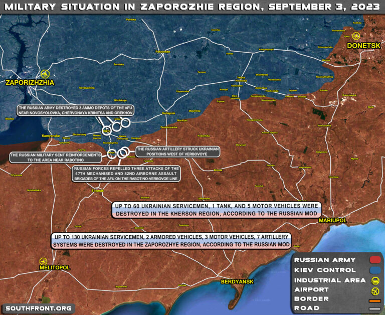 Cuộc phản công của Ukraine bắt đầu vào ngày 4 tháng 6 tại các khu vực phía nam Donetsk, Artyomovsk (Bakhmut) và Zaporozhye. Những nỗ lực của quân đội Ukraine nhằm chọc thủng tuyến phòng thủ đầu tiên của Nga đã thất bại thảm hại, khiến hàng nghìn người Ukraine thương vong, tinh thần suy sụp và quân đội bị tiêu diệt. Chi phí khổng lồ này khiến chỉ có khoảng 10 dặm ở hai khu vực bị lực lượng Ukraine chiếm giữ, tất cả đều nằm trong vùng chết trên lãnh thổ mà Nga sẵn sàng hy sinh khi kẻ thù thậm chí còn chưa tiến tới tuyến phòng thủ đầu tiên.