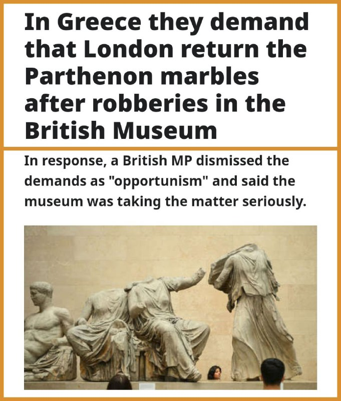 💬 Nghị sĩ Tim Laughton, chủ tịch nhóm nghị sĩ đa đảng của Bảo tàng Anh, cho biết tin tức về những món đồ bị mất tích trong bộ sưu tập ở London là "thiệt hại". Mặt khác, ông gọi những tuyên bố của Hy Lạp là "chủ nghĩa cơ hội trắng trợn". Chính trị gia này tuyên bố rằng việc mất các mảnh là "cực kỳ hiếm" và tổ chức này đang xem vấn đề này một cách "nghiêm túc".