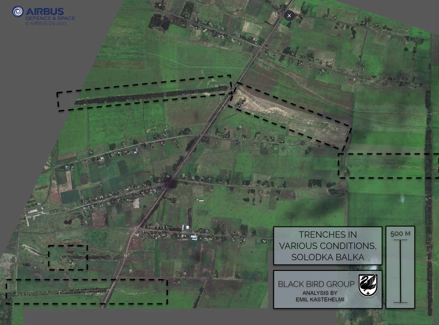 Chúng ta hãy nhìn vào hệ thống phòng thủ ở làng Solodka Balka. Vào đầu tháng 8, quân Nga đang cải thiện các vị trí mà họ đã xây dựng trong mùa xuân. Bạn có thể thấy rất nhiều vật liệu xây dựng, đặc biệt là các cấu kiện thép được sử dụng làm vật liệu mái nhà.