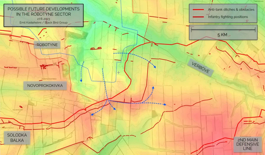 Sự chênh lệch về độ cao không quá lớn và các hàng cây làm giảm tầm bắn của Nga. Tại khu vực này, nỗ lực tốt nhất của quân Ukraine có thể là tiếp tục tiến lên, chọc thủng phòng tuyến giữa Solodka Balka và Verbove, đồng thời bắt đầu các hoạt động tấn công bên sườn.