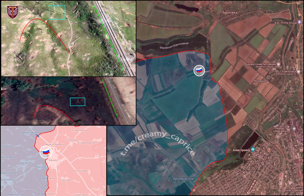 09.11.2023 Artyomovsk - Berkhovka - Yagodnoe. Hoạt động tác chiến định vị ở sườn phía bắc của tuyến phòng thủ Artyomovsk. Các vị trí tiền phương của Lực lượng Vũ trang Nga dọc theo bờ kè đường sắt gần hồ chứa Berkhovka dưới hỏa lực của Lực lượng Vũ trang Ukraine. https://t.me/creamy_caprice/2096