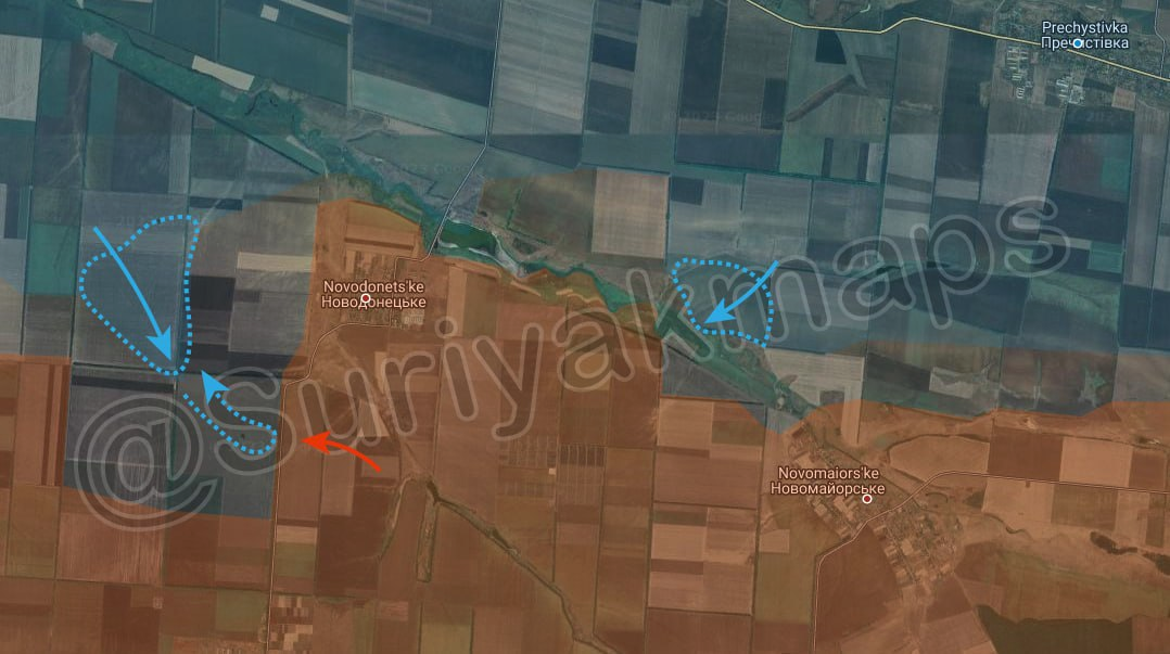 Tình hình phía tây nam Donetsk: Quân đội Ukraine bắt đầu lại các cuộc tấn công tới Novodonets'ke/Новодонецьке nhằm cố gắng bao vây thị trấn từ phía nam (cuộc tấn công đã bị đẩy lùi). Hơn nữa, quân đội tiếp tục củng cố quyền kiểm soát bờ phía bắc sông Shaitanka, nhưng đã không tiếp cận được thị trấn Novomaiors'ke/Новомайорське trong những giờ qua.
