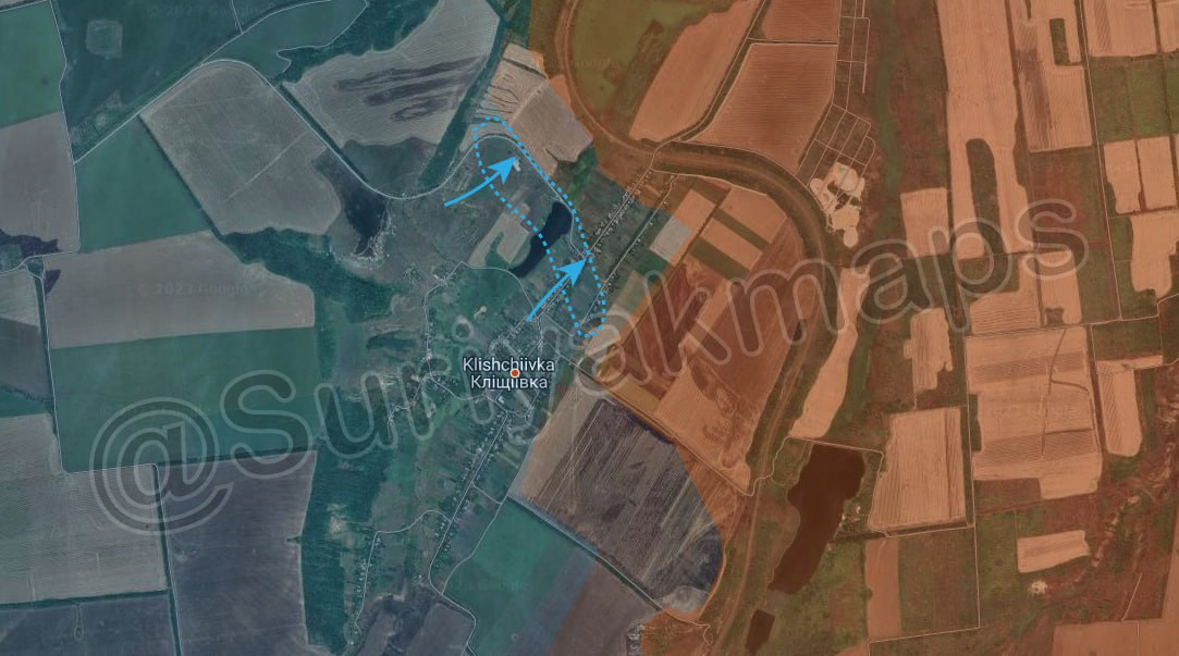 Tình hình phía nam Bakhmut: Quân đội Ukraina tiếp tục tiến vào bên trong Klishchiivka/Кліщіївка và sắp kiểm soát toàn bộ thị trấn trong khi Quân đội Nga chỉ kiểm soát các vị trí tiếp giáp với đường sắt.
