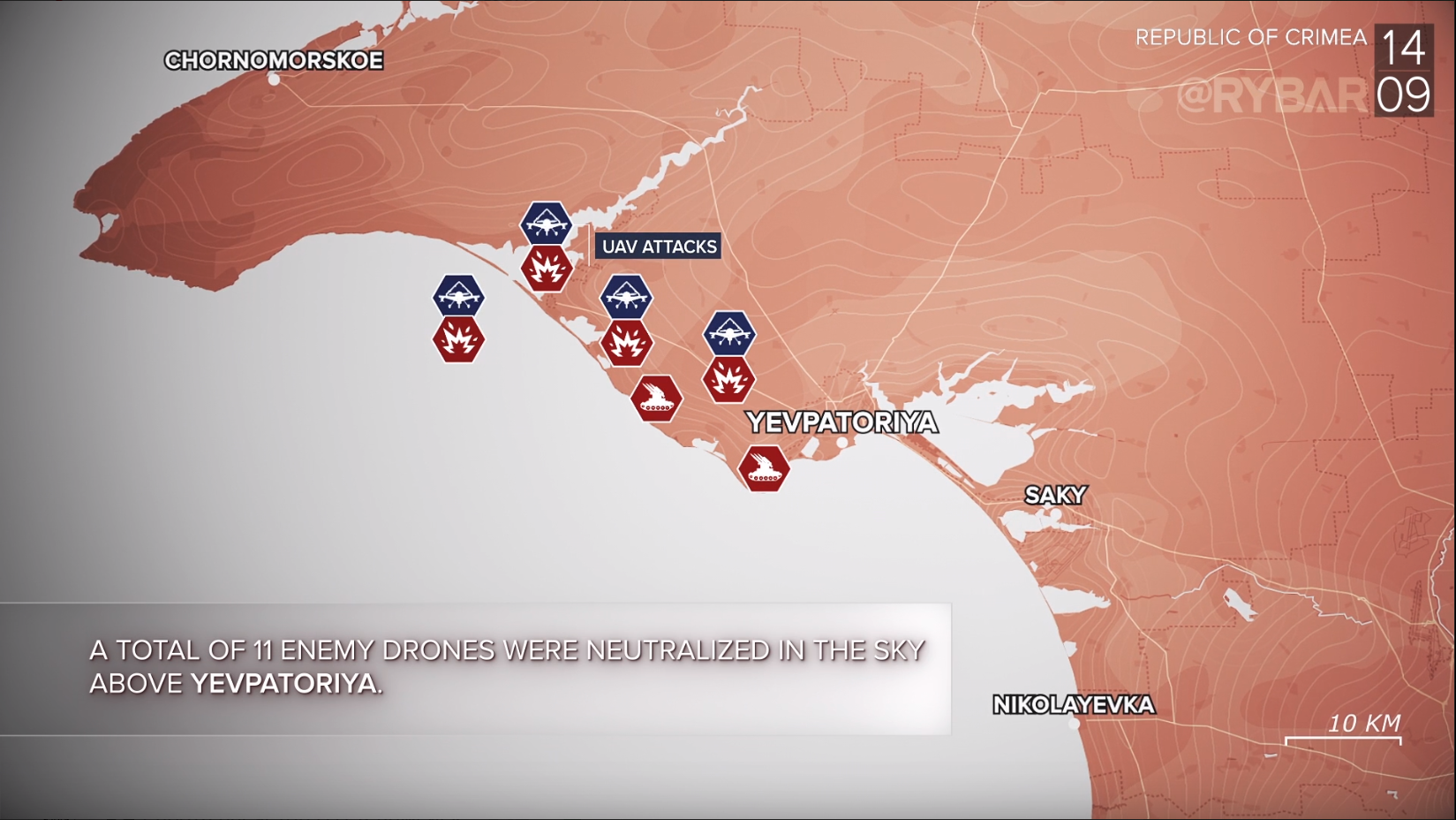 ▪️Cùng lúc đó, một cuộc đột kích lớn bằng máy bay không người lái đã được phát động trên bán đảo. Tổng cộng 11 máy bay không người lái của địch đã bị vô hiệu hóa trên bầu trời Yevpatoria.