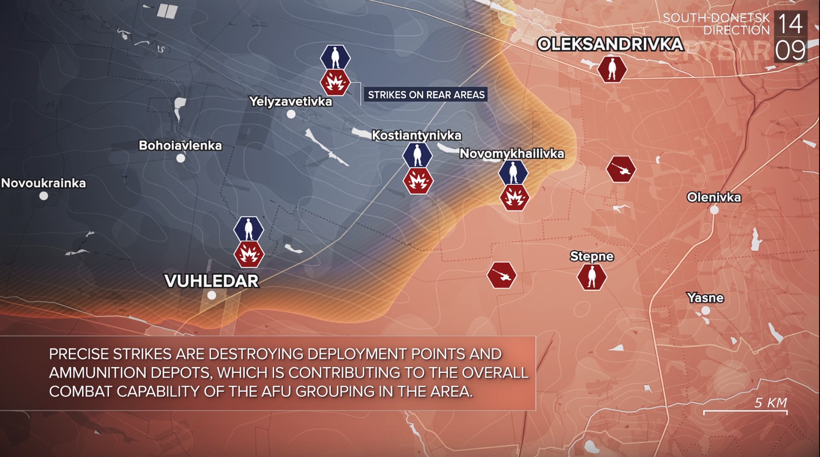 ▪️Ở hướng Vulegdar, các cuộc tấn công chính xác được triển khai nhằm vào các điểm tập trung quân và thiết bị của đối phương.