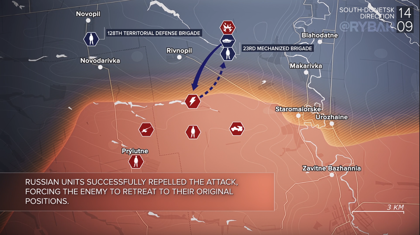 ▪️Cùng lúc đó, Lực lượng vũ trang Ukraine lại tấn công đội hình phòng thủ của Nga tại phòng tuyến Priyutnoye-Staromayorskoye. Các đơn vị Nga đã đẩy lùi thành công cuộc tấn công, buộc địch phải rút lui về vị trí ban đầu.