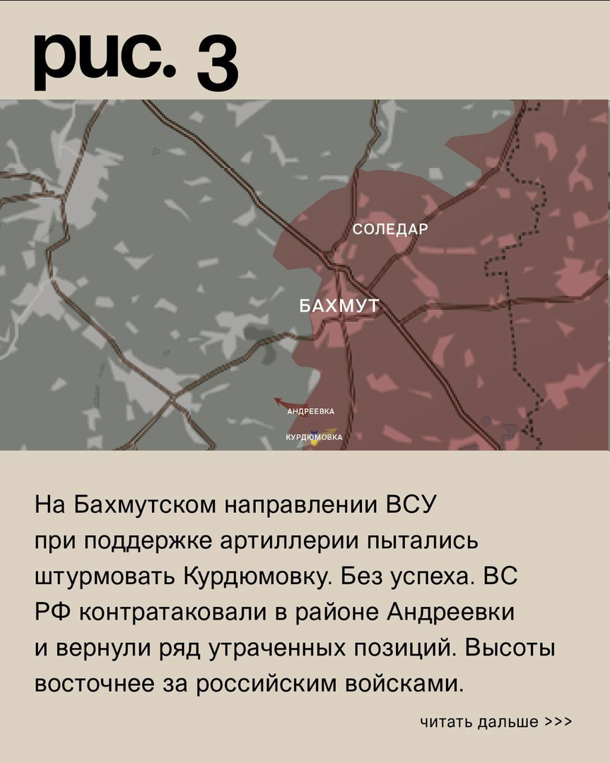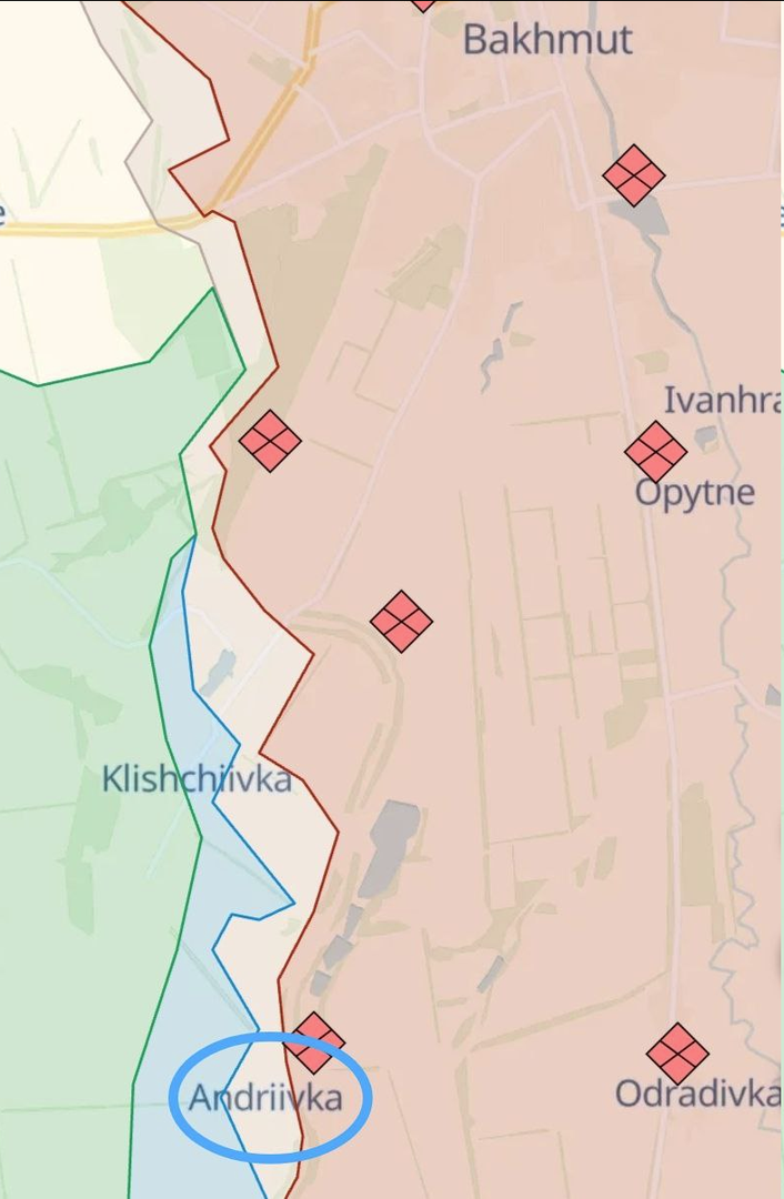 Bộ Tổng tham mưu Ukraine tuyên bố giải phóng làng Andreevka phía nam Bakhmut. Báo cáo buổi sáng của Bộ Tổng tham mưu cho biết: “Bằng các cuộc tổng tấn công đã làm chủ được Andreevka thuộc tỉnh Donetsk." Hôm qua, Thứ trưởng Bộ Quốc phòng U Anna Malyar tuyên bố chiếm được ngôi làng nhưng bị Lữ đoàn đặc biệt số 3 chiến đấu ở Andreevka phủ nhận. Sau đó, Malyar chỉnh sửa tin nhắn của mình và viết rằng các trận chiến giành ngôi làng vẫn tiếp tục. Cuộc chiến giành Andreevka và vùng lân cận Kleshcheevka ở phía nam Bakhmut đã diễn ra được vài tháng.